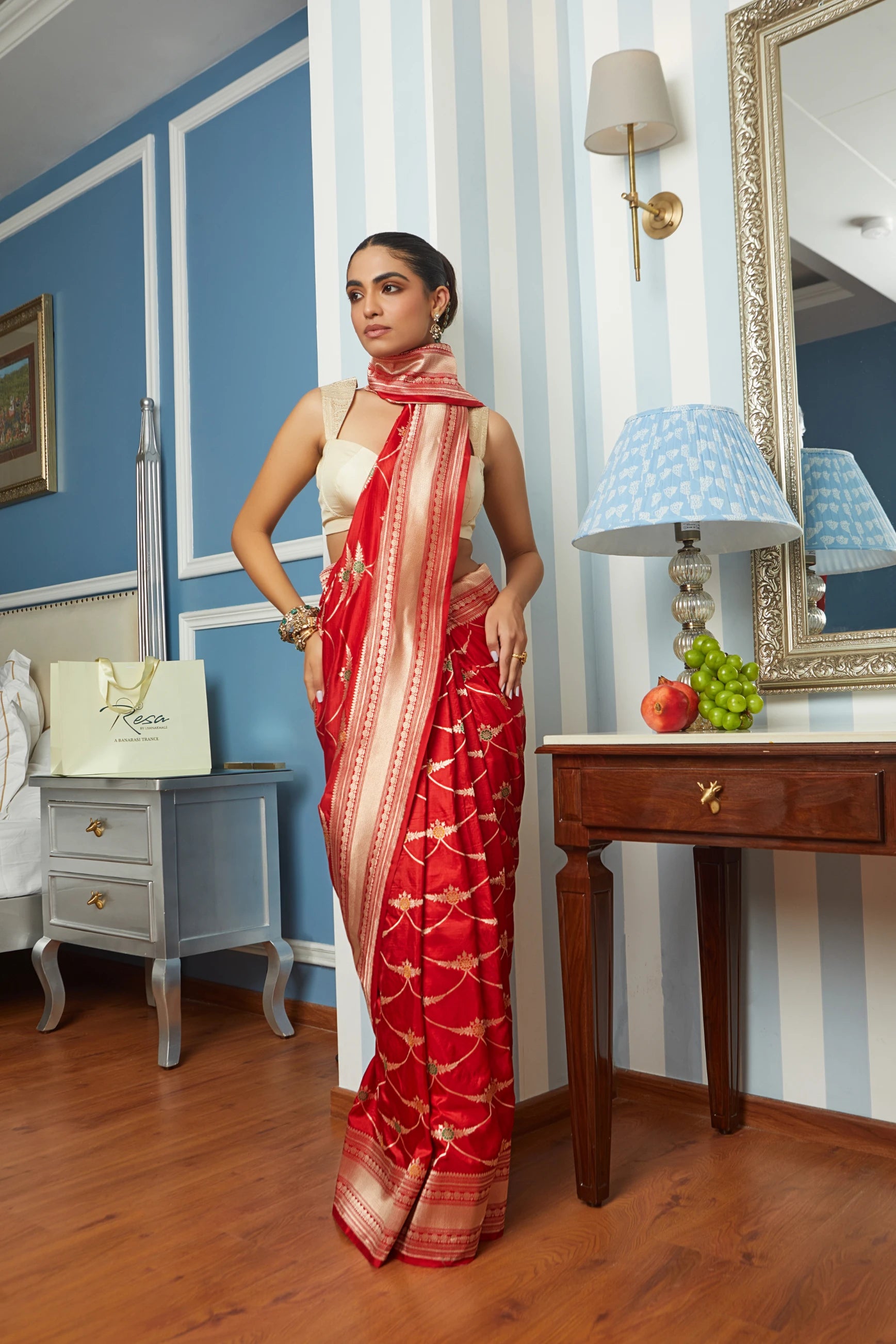 This exquisite red Katan silk Banarasi saree features intricate meenakari jaal weaving, bringing together artistry and elegance. A symbol of heritage luxury, it’s perfect for bridal or festive grandeur.