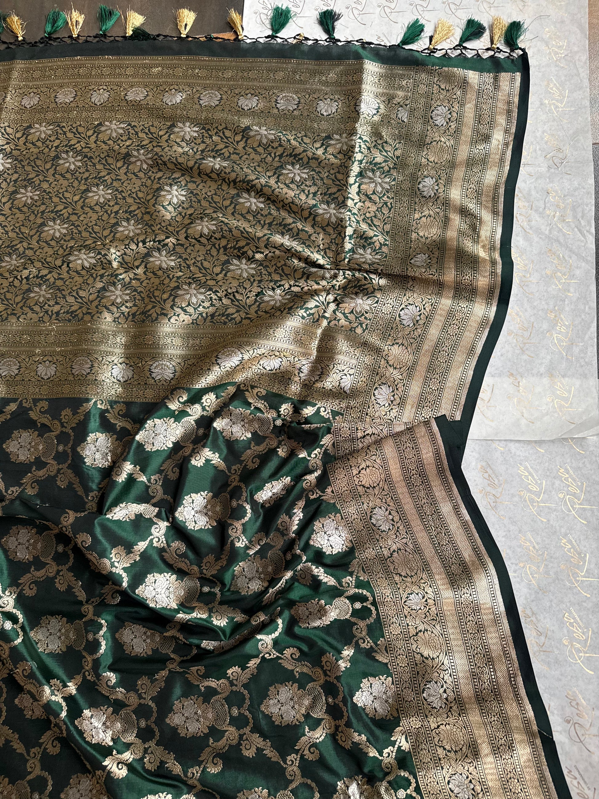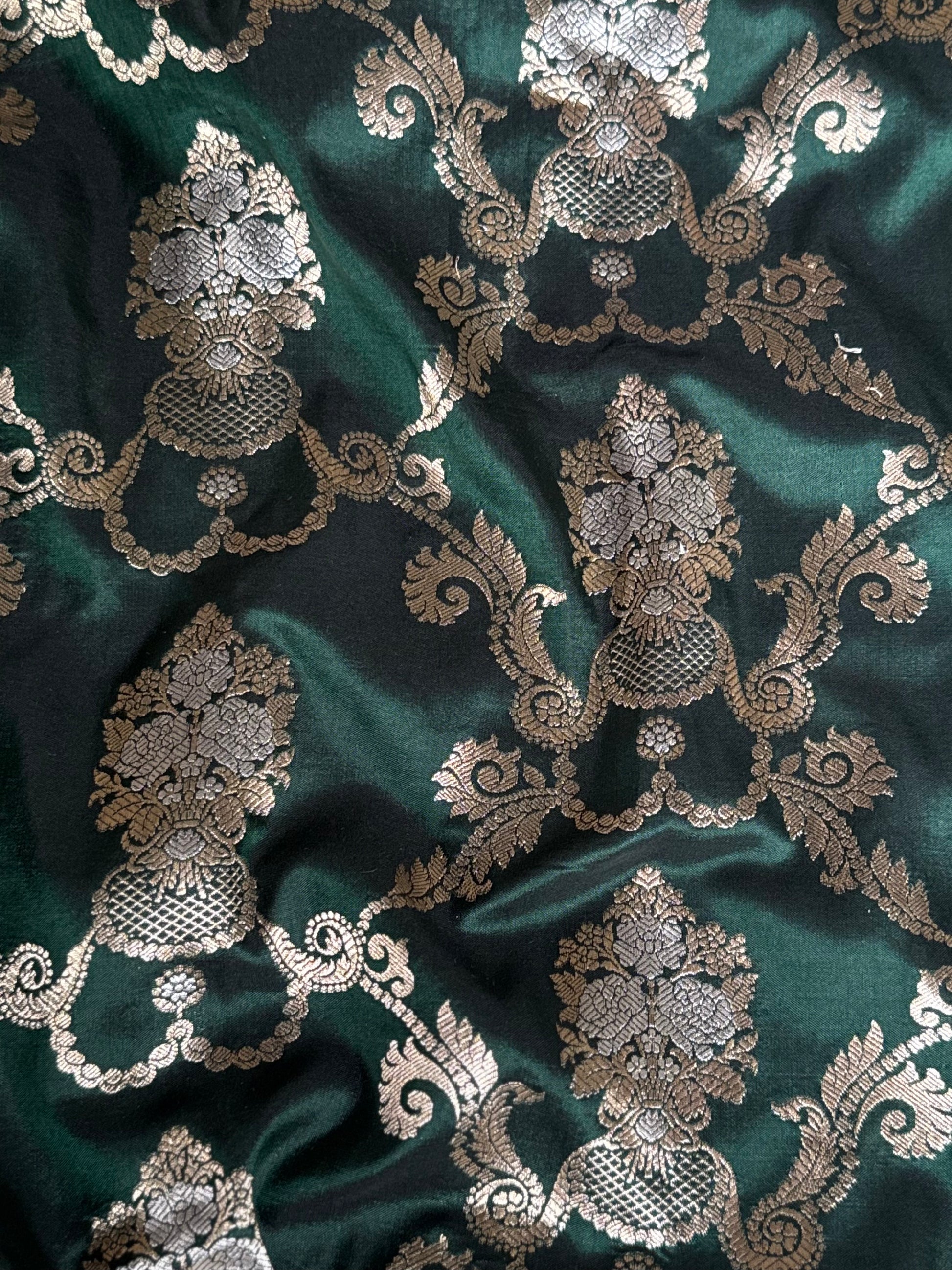 Handwoven in luxurious Katan silk, this bottle green saree features an intricate all-over jaal pattern that reflects classic Banarasi artistry. Its rich hue, smooth drape, and lustrous finish create a timeless and regal silhouette perfect for weddings, festive occasions, and grand celebrations. The detailed craftsmanship adds depth and sophistication to every fold, making it a standout addition to any wardrobe. Please note: the last image displayed is of the blouse.