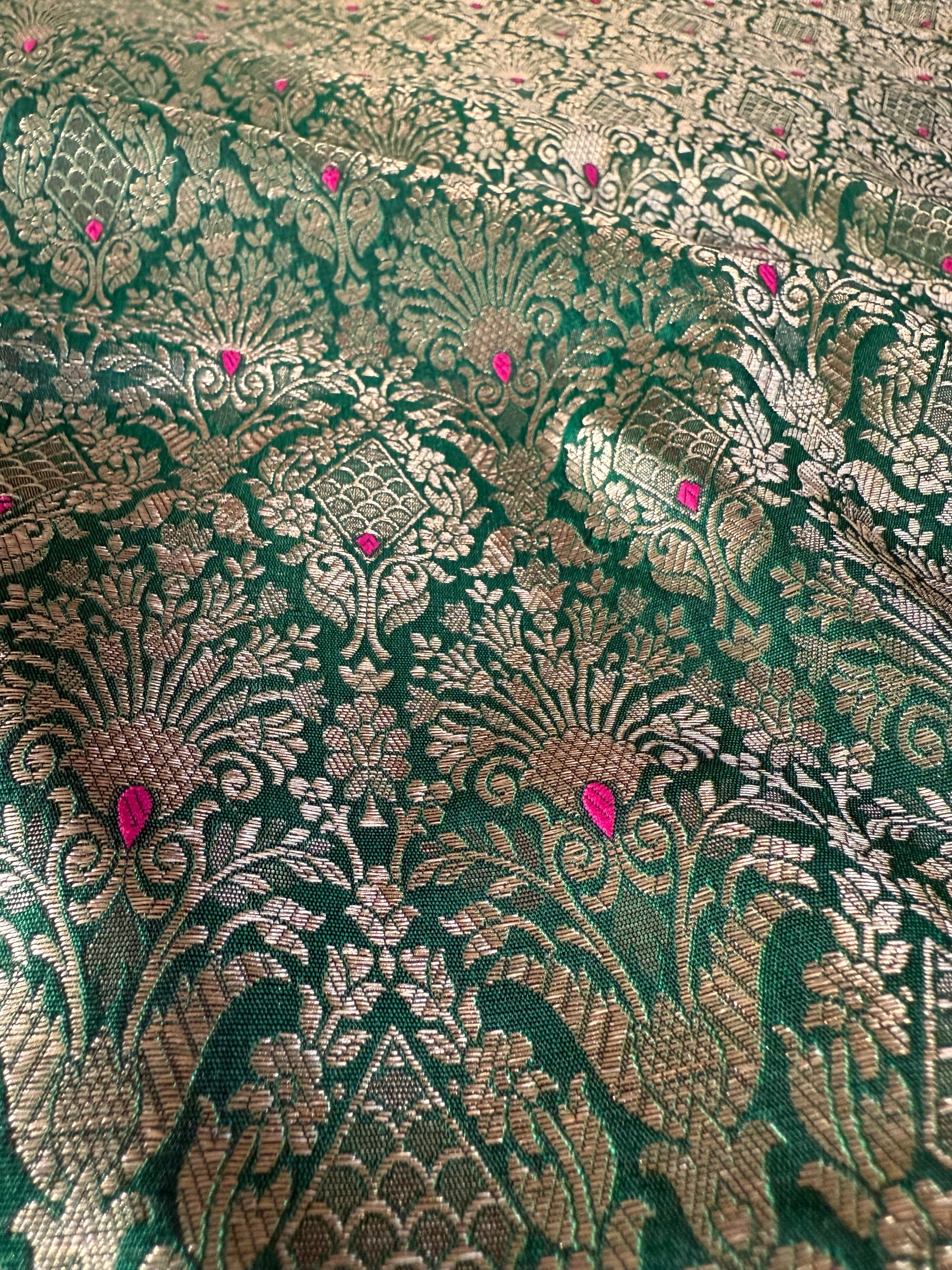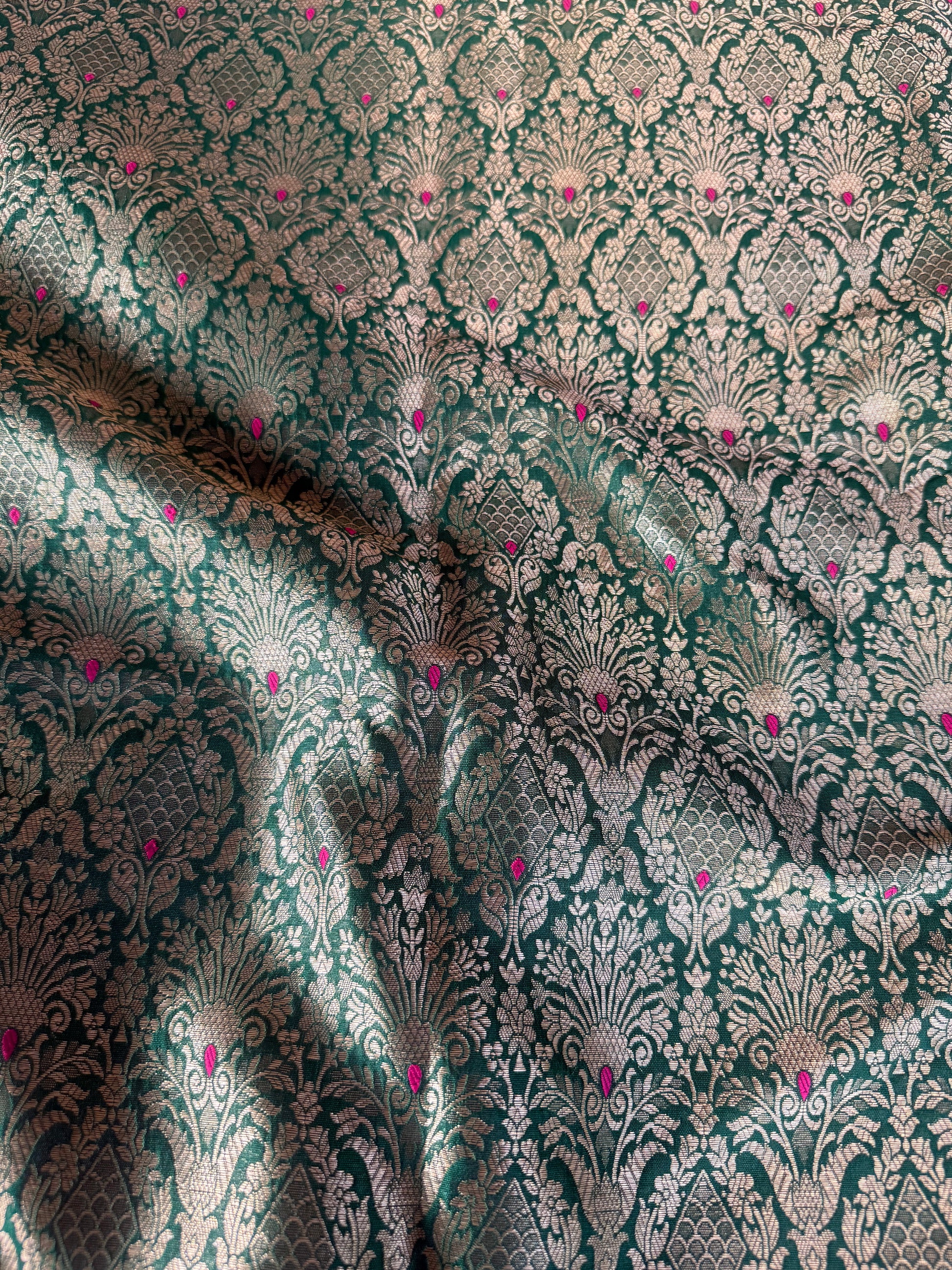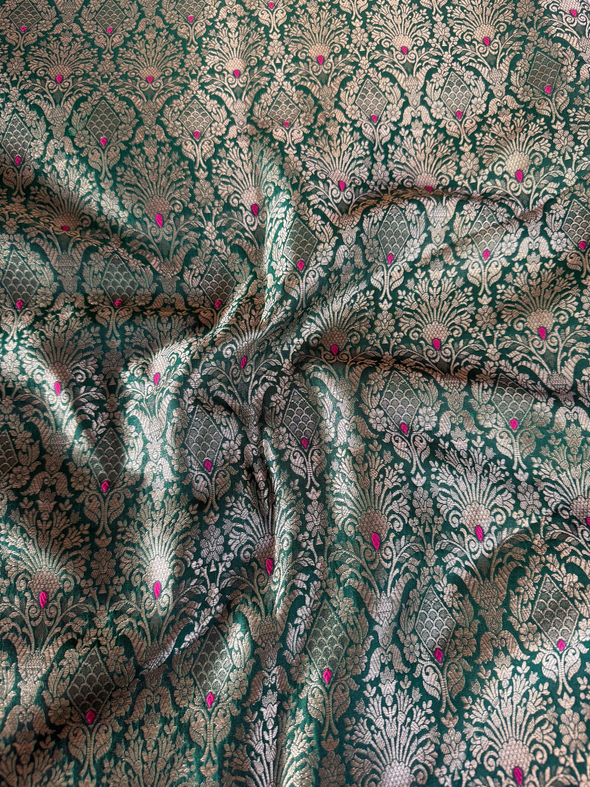 Opulent and vibrant, this Handwoven Bottle Green Meenakari Brocade Thaan features rich zari brocade weaving adorned with intricate meenakari highlights. The deep bottle green hue adds a regal charm, while the detailed craftsmanship reflects true Banarasi artistry — perfect for crafting luxurious traditional outfits with a statement of elegance.