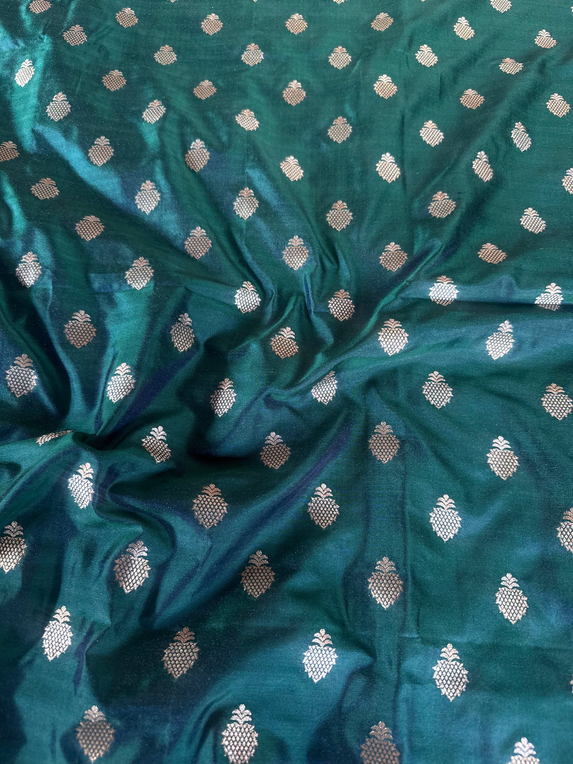 ich and striking, this Handwoven Bottle Green Shot Colour Silk Kadhwa Pineapple Buta Thaan features beautifully woven kadhwa pineapple motifs on a shimmering shot-colour silk base. The blend of deep green tones with intricate zari detailing creates a luxurious look — perfect for crafting elegant and unique traditional ensembles.