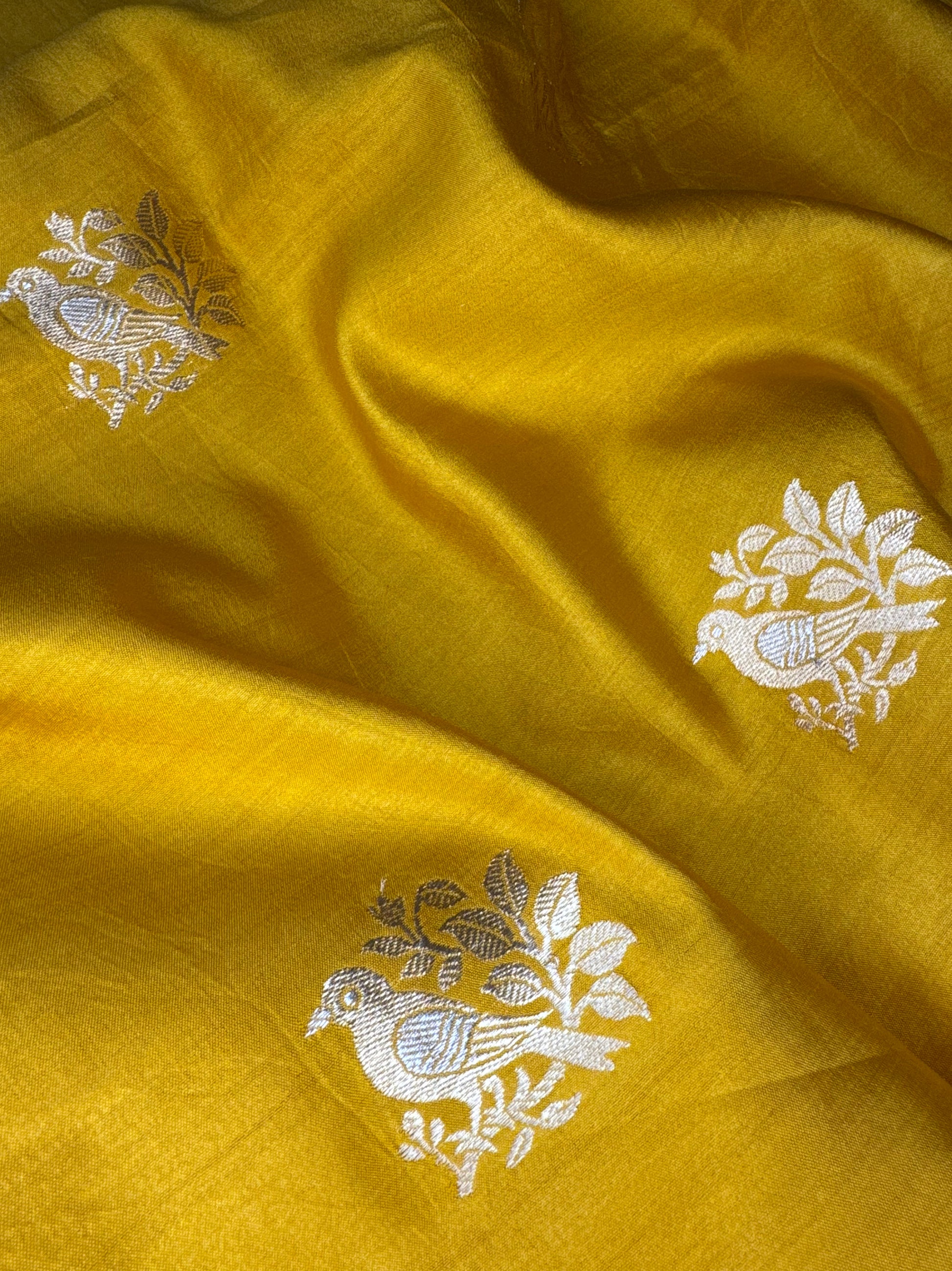 Handwoven in lustrous Chinniya silk, this thaan features delicate bird motifs that bring a touch of charm and artistry to the fabric. Its smooth texture, gentle sheen, and fluid drape make it ideal for crafting bespoke blouses, suits, lehengas, jackets, or elegant festive wear. The intricate weaving and refined detailing reflect the beauty of traditional craftsmanship, offering a timeless and graceful appeal for custom creations.