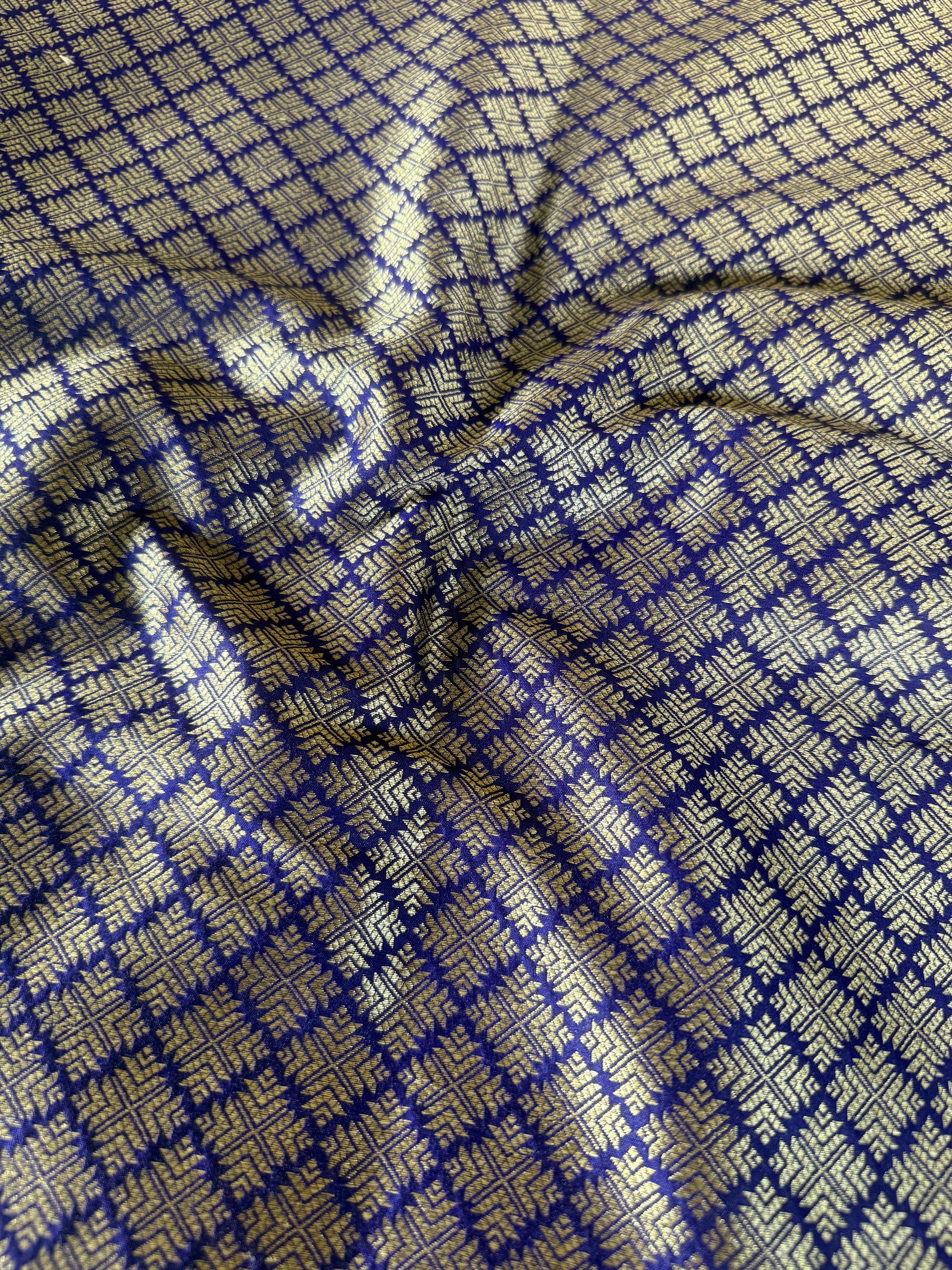 Modern yet traditional, this Handwoven Indigo Silk Abstract Brocade Thaan features unique abstract motifs woven in rich zari on a deep indigo silk base. The luxurious texture and striking pattern showcase refined Banarasi craftsmanship — perfect for creating elegant, contemporary traditional wear with a bold artistic touch.