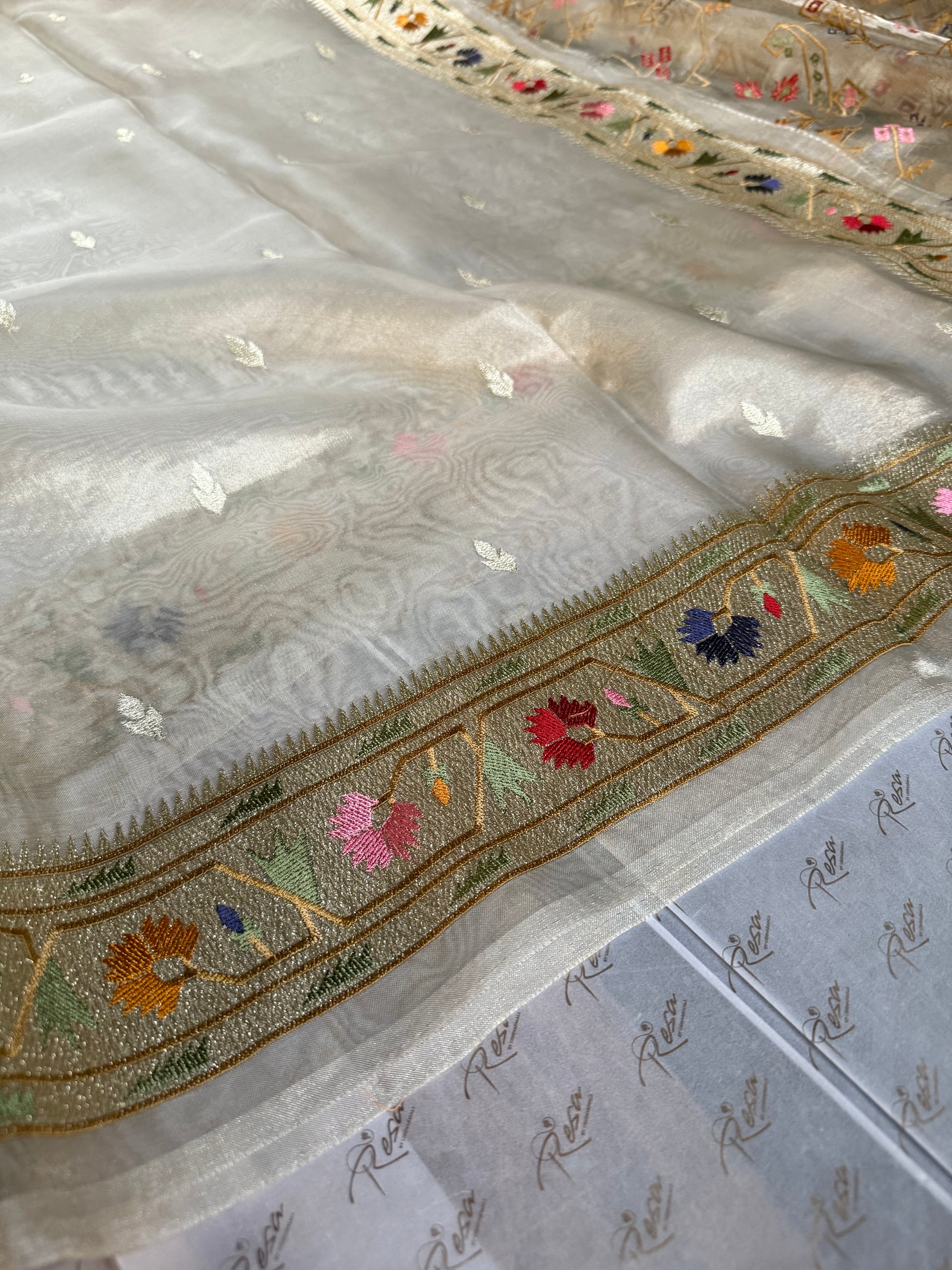 Handwoven Silver Tissue Saree With Paithani Resham Work Border