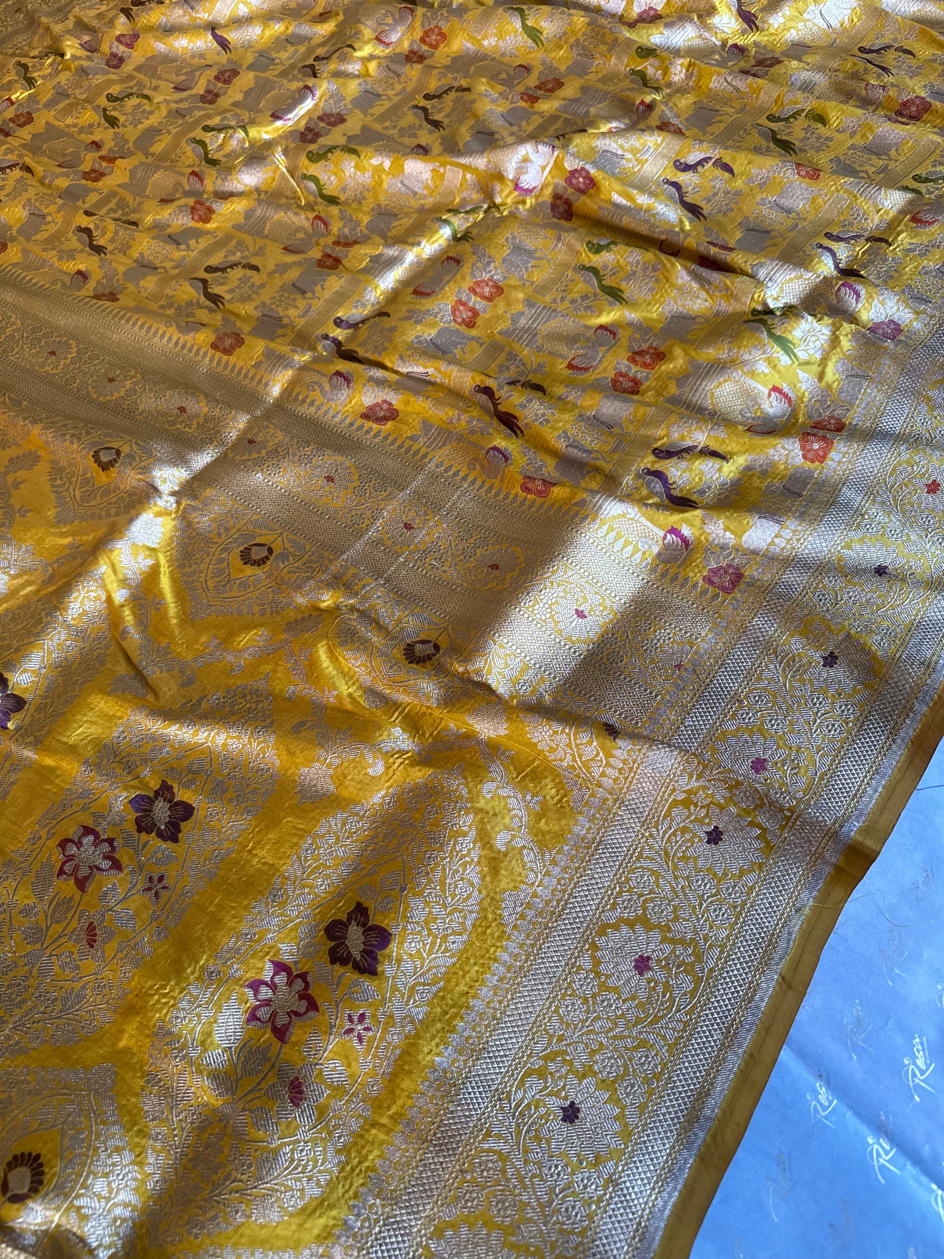 Regal and artistic, this handwoven Yellow Shikargah meenakari saree showcases exquisite jungle-inspired motifs with fine meenakari highlights. The rich silk base and detailed craftsmanship make it perfect for weddings and grand celebrations.