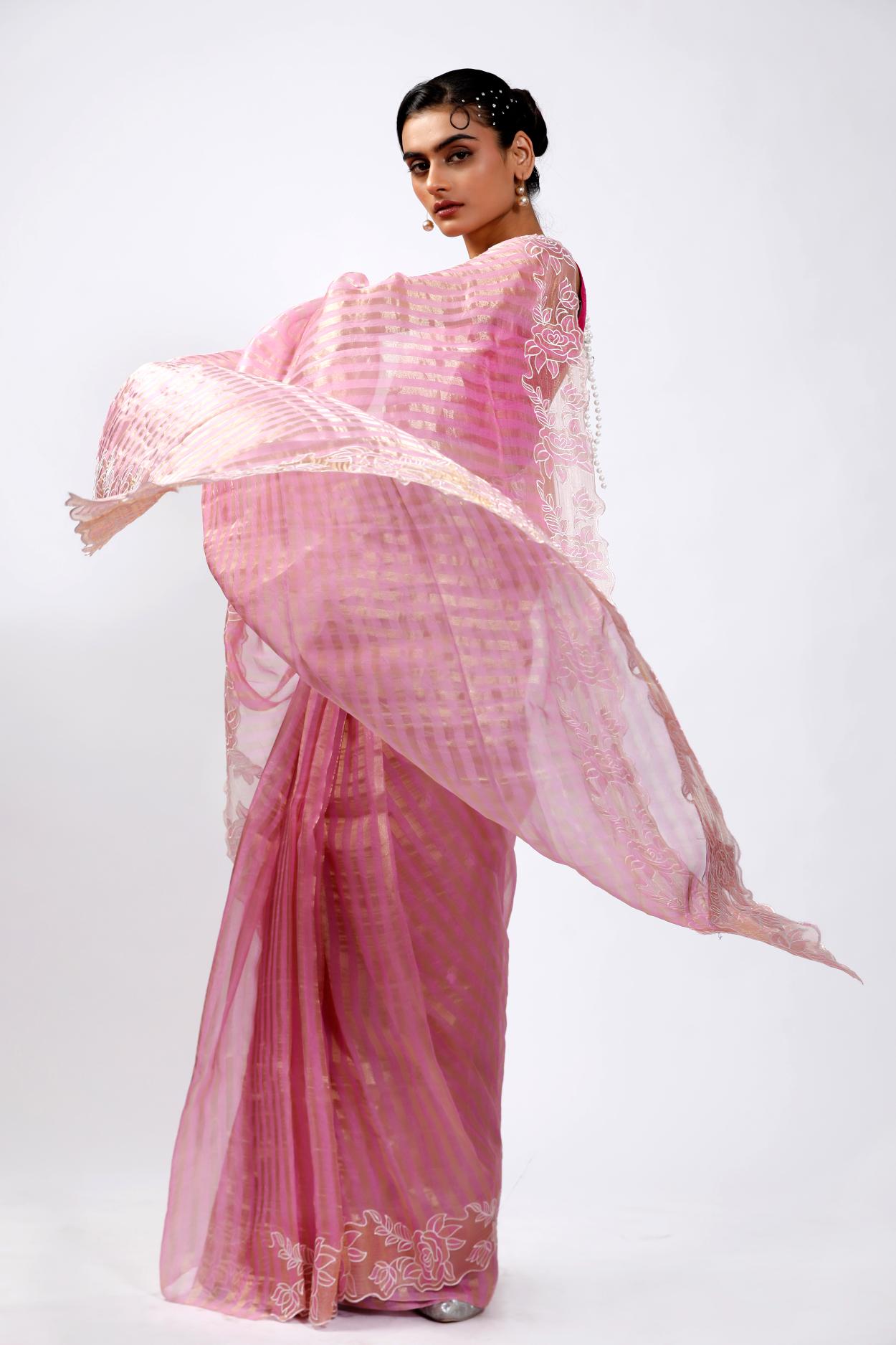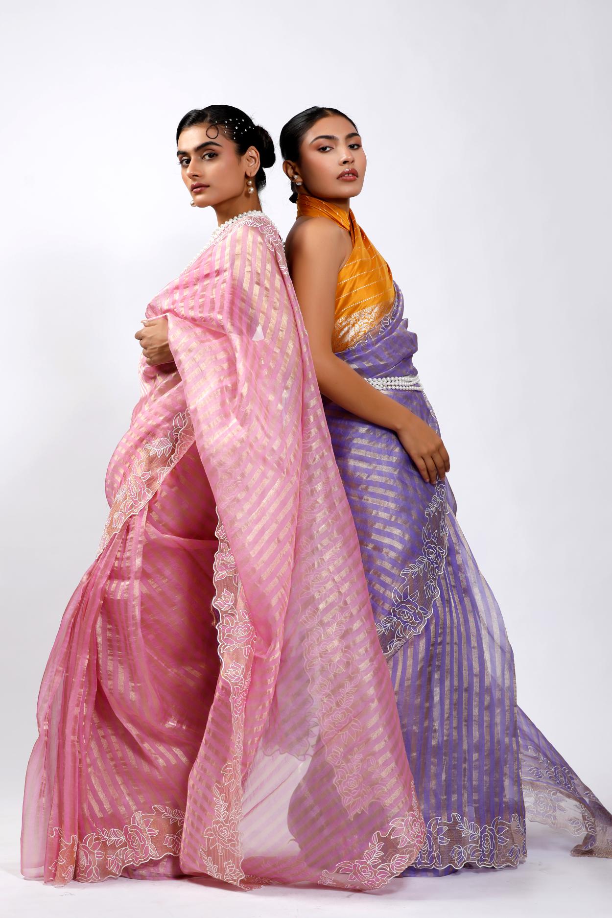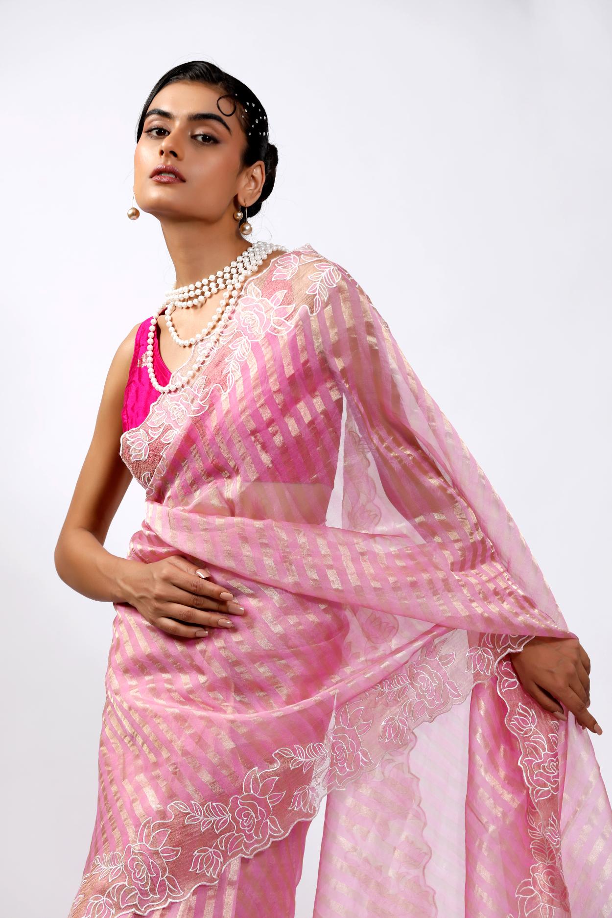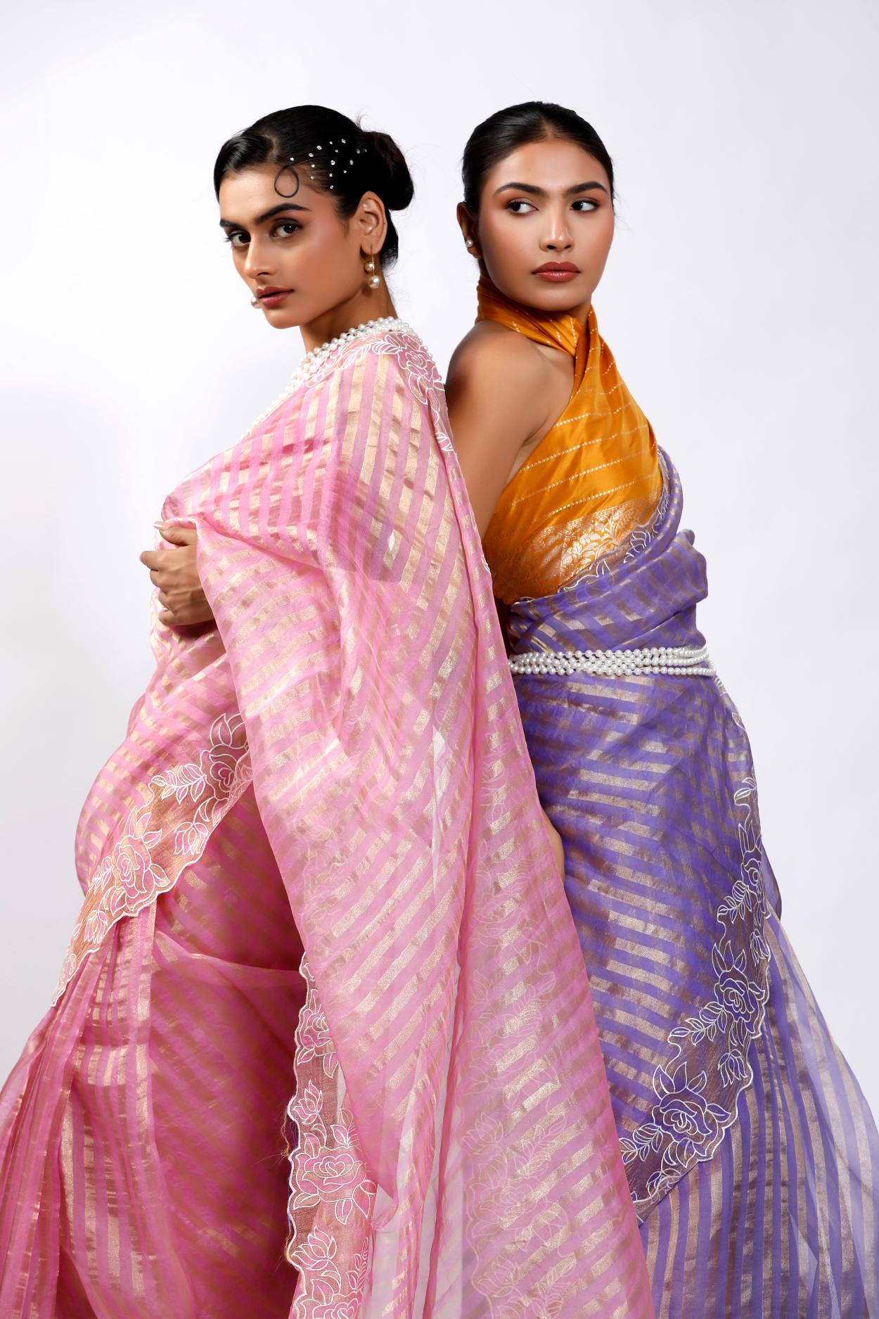 Gracefully handwoven, this georgette tissue saree features delicate stripes that flow seamlessly across the fabric. The edges are adorned with intricate floral threadwork, adding a subtle yet captivating detail. Lightweight and airy, it blends traditional craftsmanship with modern elegance, making it perfect for both festive occasions and sophisticated gatherings.