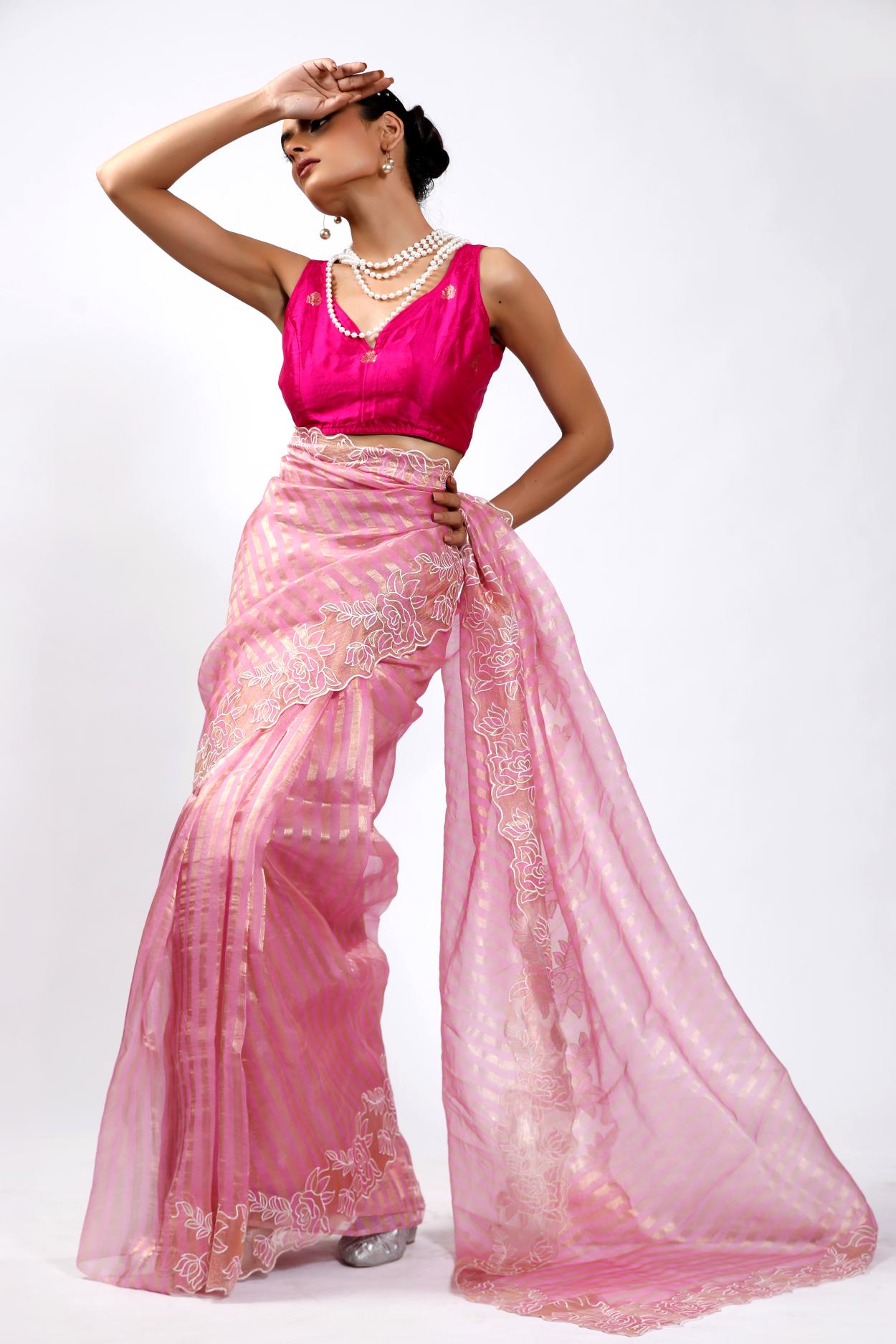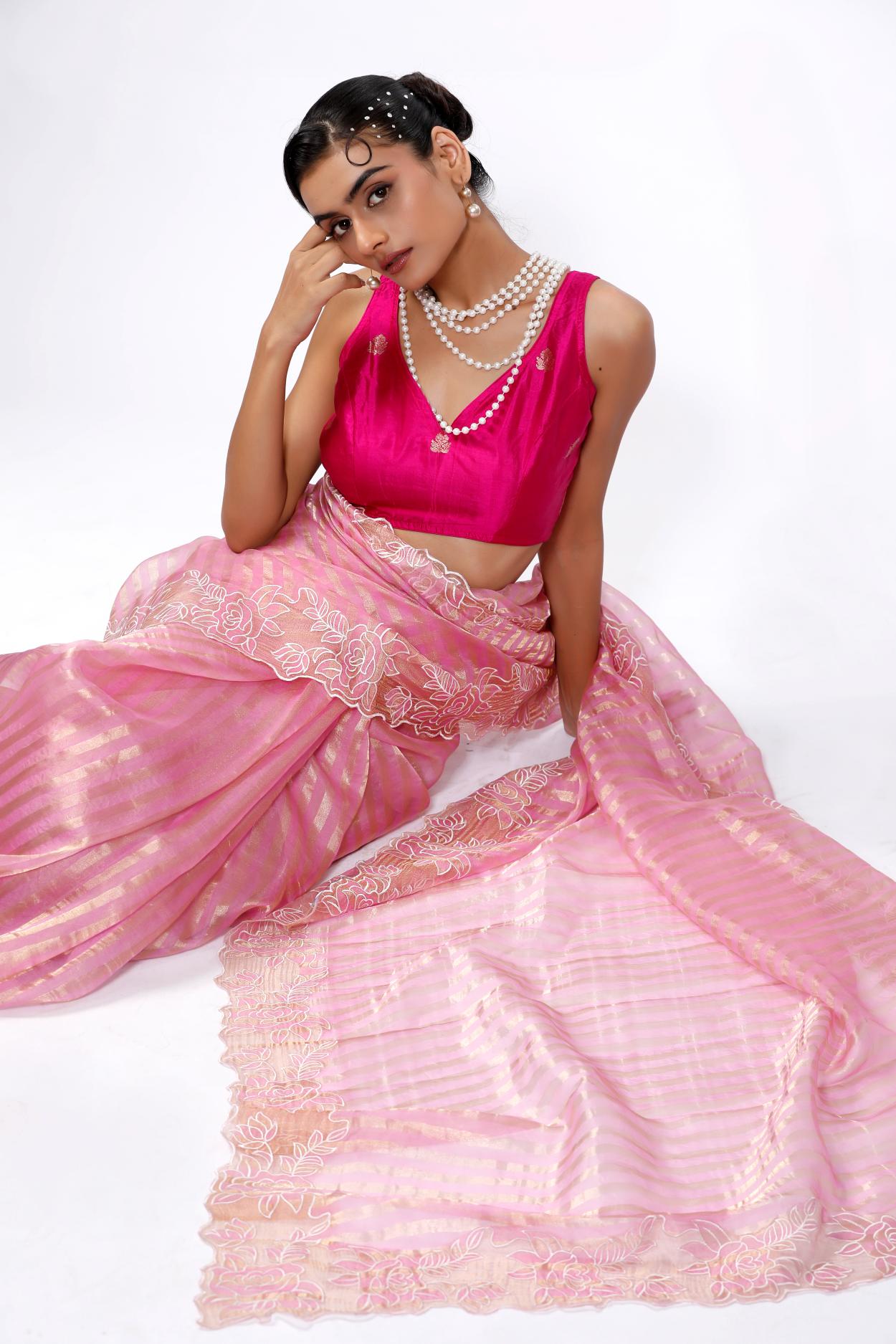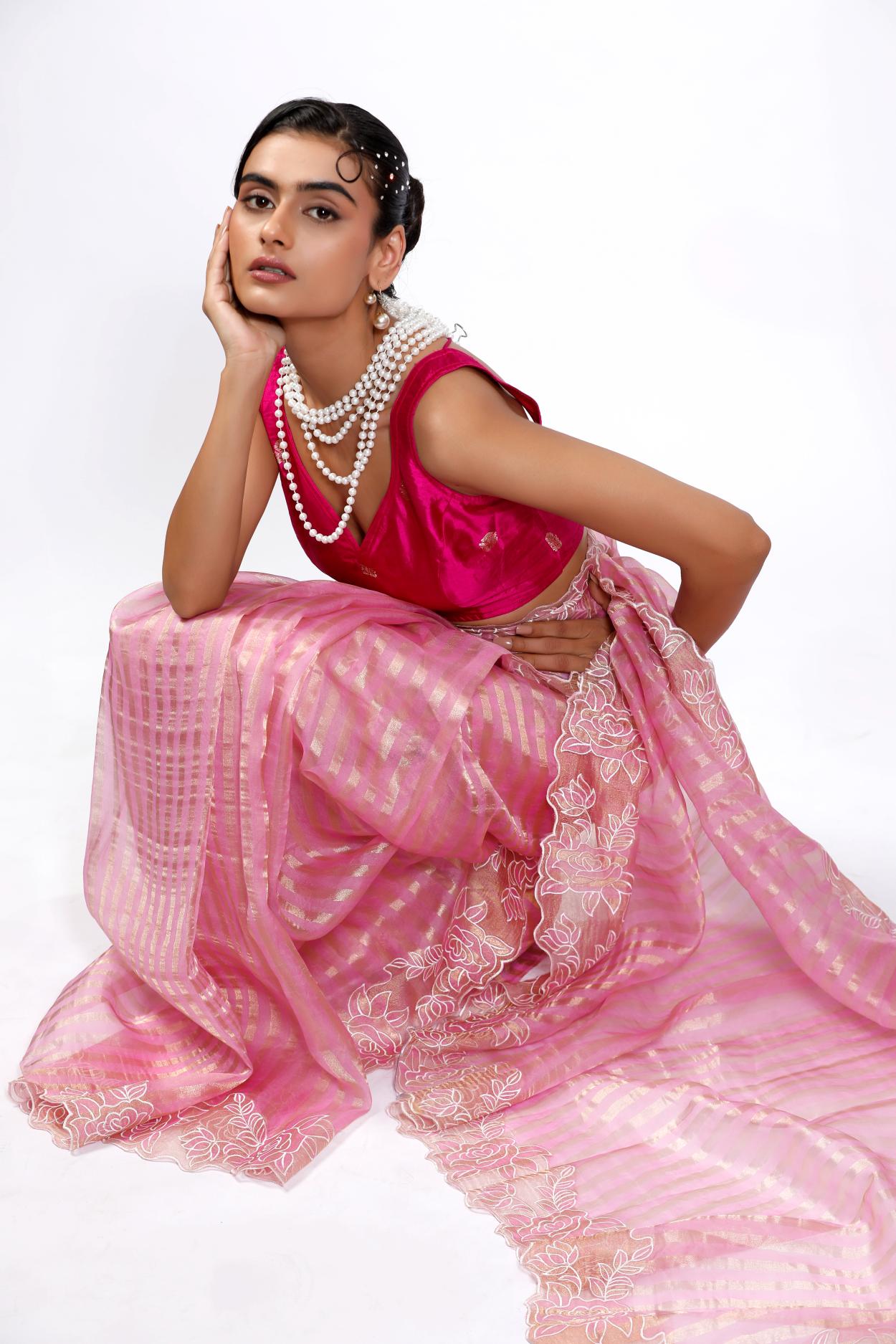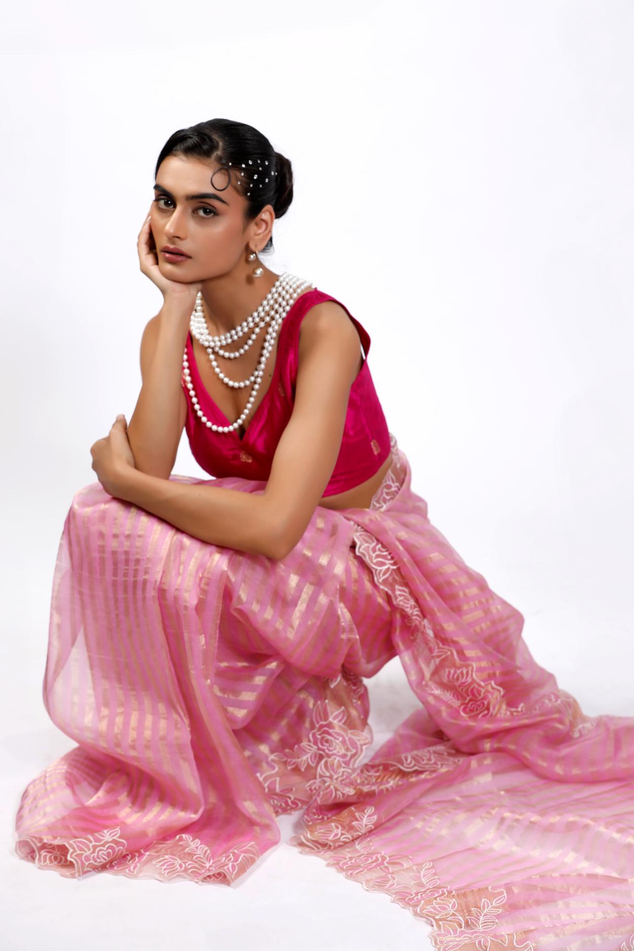 Gracefully handwoven, this georgette tissue saree features delicate stripes that flow seamlessly across the fabric. The edges are adorned with intricate floral threadwork, adding a subtle yet captivating detail. Lightweight and airy, it blends traditional craftsmanship with modern elegance, making it perfect for both festive occasions and sophisticated gatherings.
