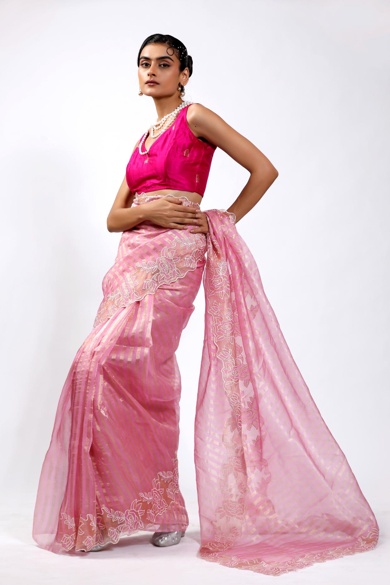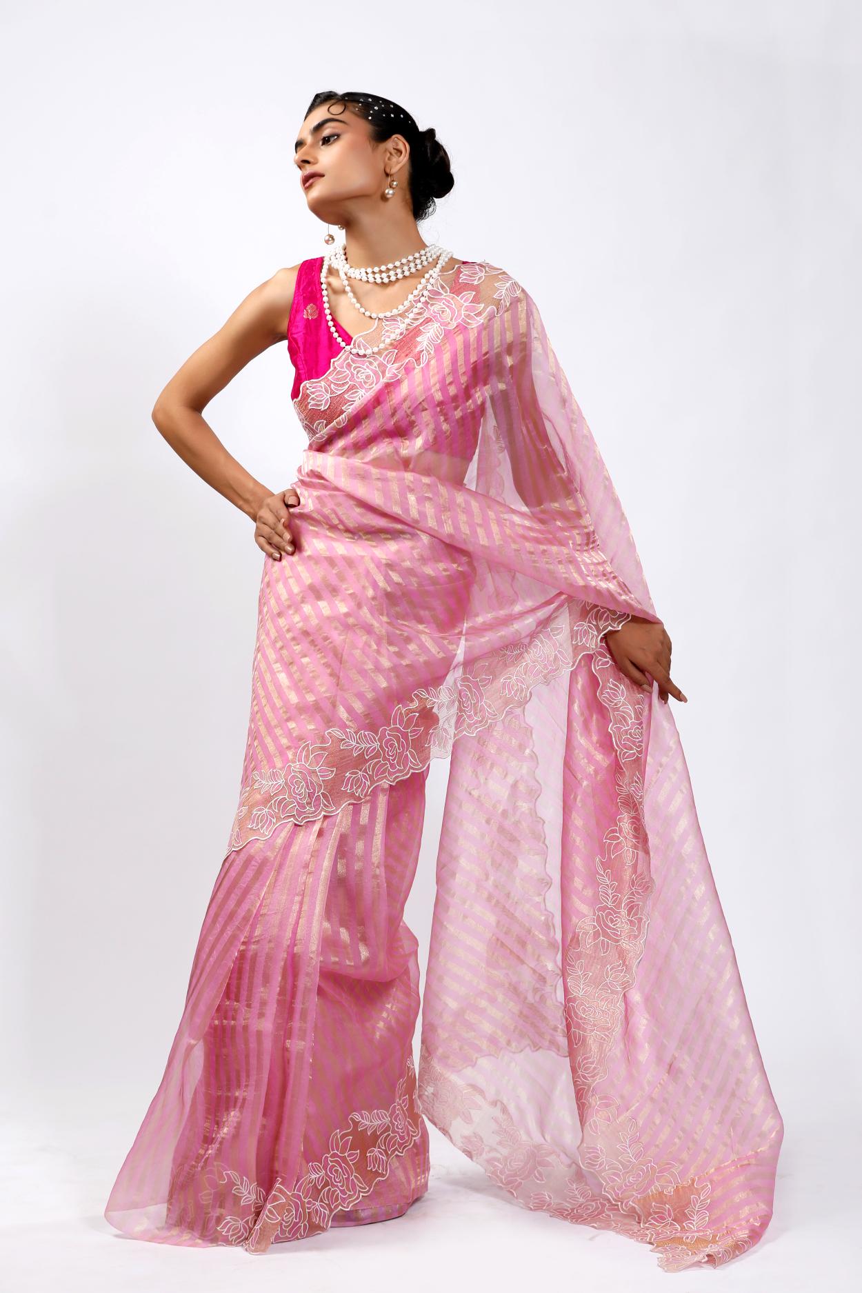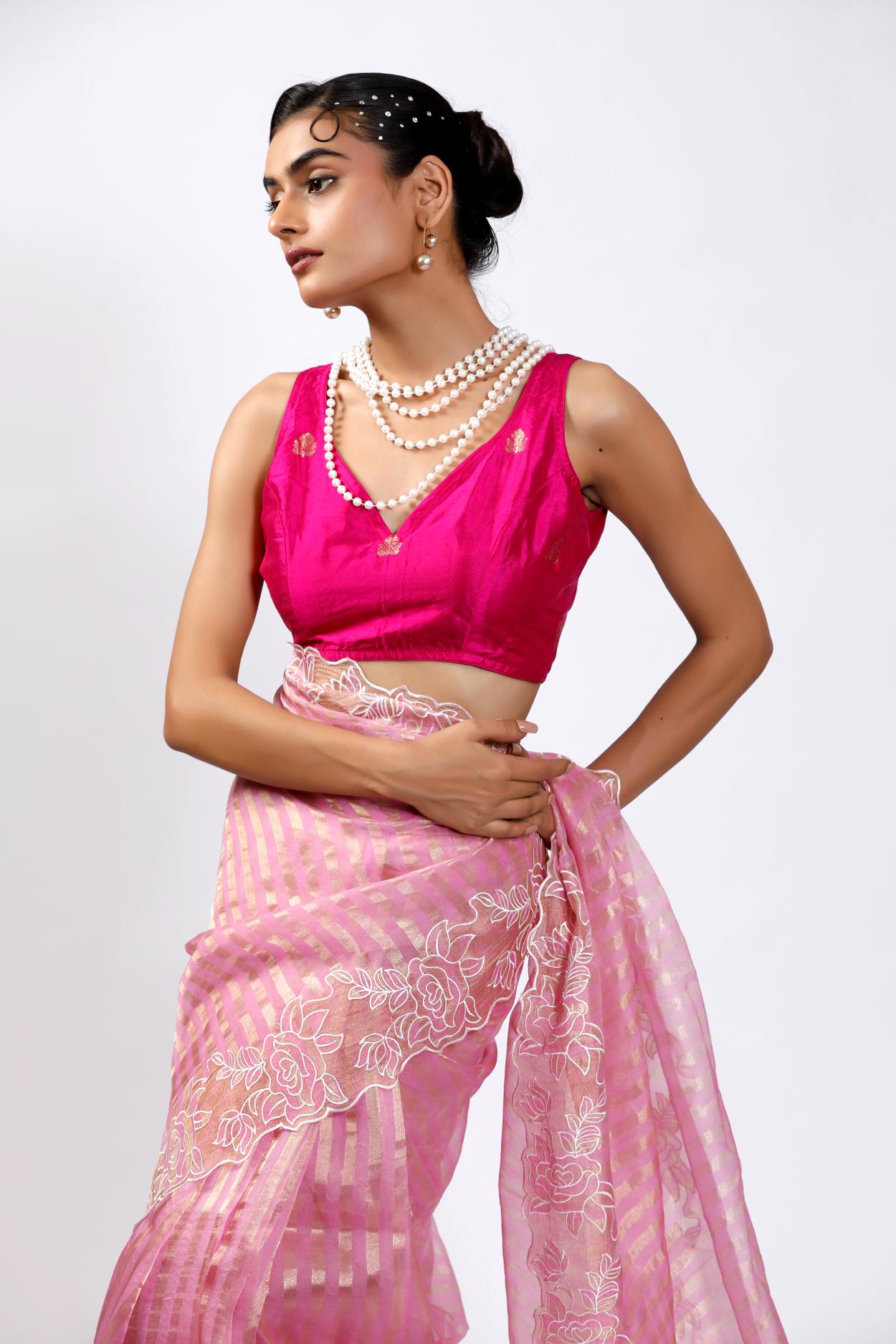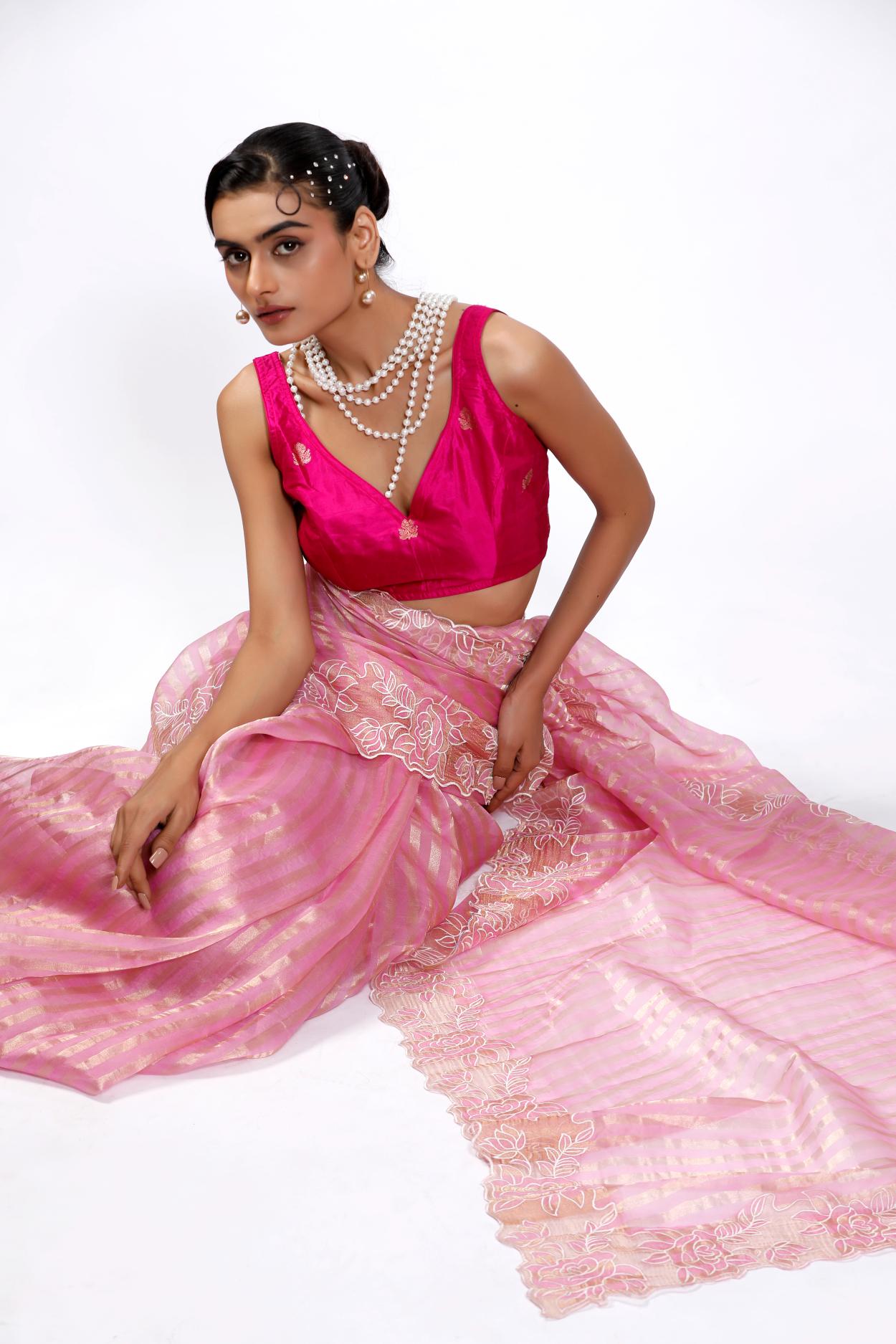 Gracefully handwoven, this georgette tissue saree features delicate stripes that flow seamlessly across the fabric. The edges are adorned with intricate floral threadwork, adding a subtle yet captivating detail. Lightweight and airy, it blends traditional craftsmanship with modern elegance, making it perfect for both festive occasions and sophisticated gatherings.