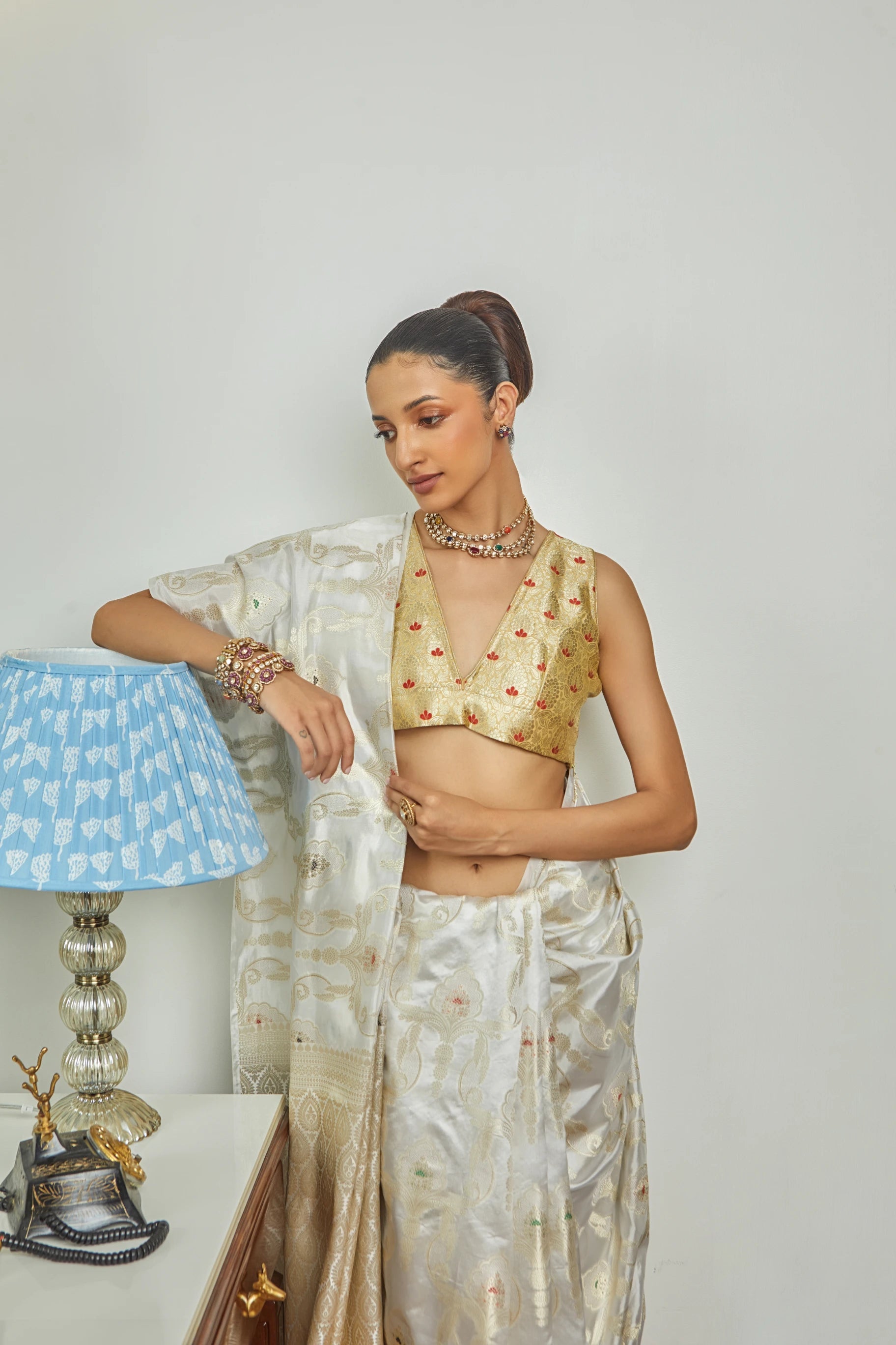 Handwoven Ivory Soft Silk Meenakari Jaal Banarasi Saree
